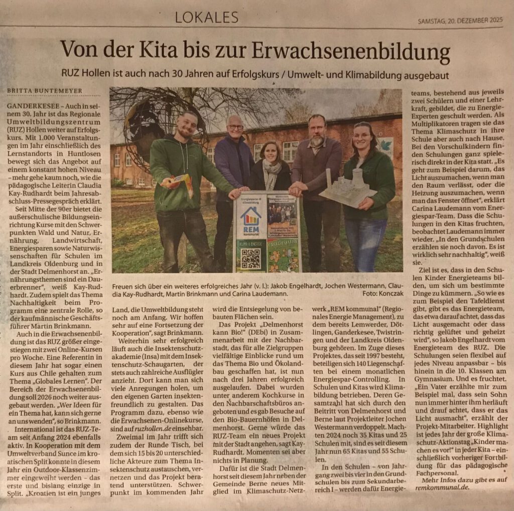 - Neue Energieteams in Schulen & Kitas: Gutes Klima in Berne!Seit diesem Jahr ist die Gemeinde Berne Teil des Klimaschutz-Netzwerkes „REM kommunal“. Insgesamt beteiligen sich nun schon sieben Kommunen aus dem Oldenburger Land und dem Landkreis Diepholz an dieser Kooperation. 💪 Was bedeutet das konkret für Berne? In Zusammenarbeit mit dem Umweltzentrum Hollen wird an den Grundschulen und Kindertagesstätten Klimabildung durchgeführt. So waren kürzlich die… Neue Energieteams in Schulen & Kitas: Gutes Klima in Berne! weiterlesen
